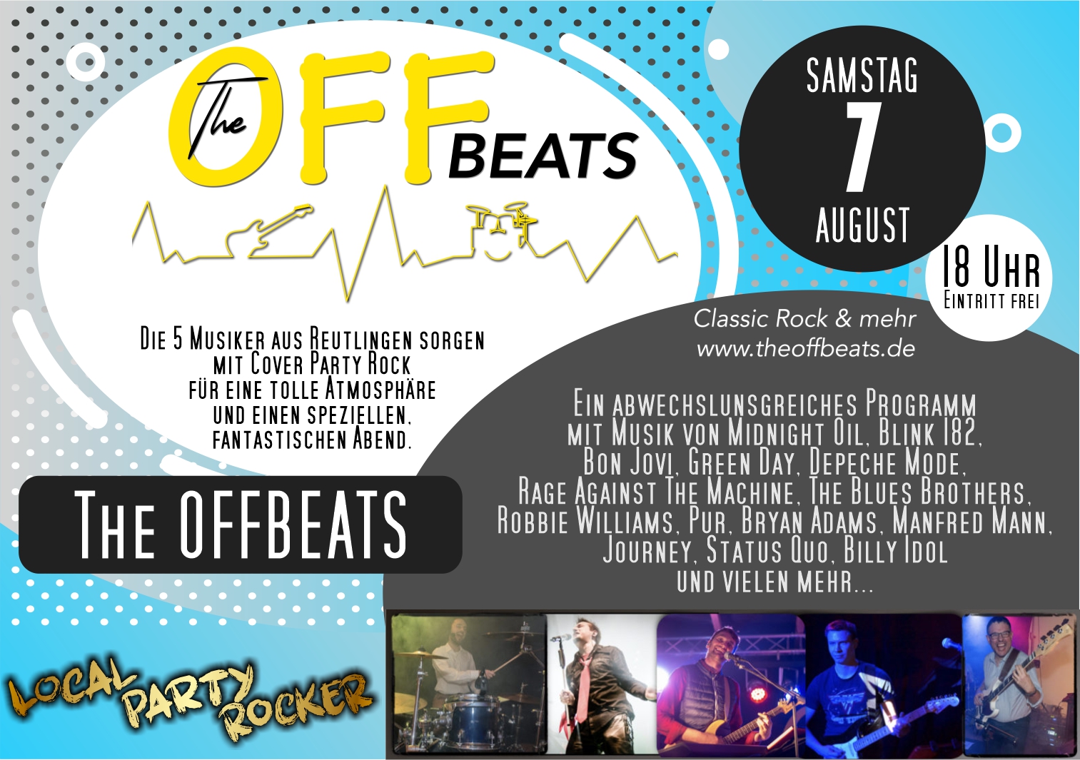 Es ist fast zu schön um war zu sein, aber wir näheren uns dem ersten Konzerttermin in 2021. Am 6.August gibt es ein Pokalspiel beim TSV Holzelfingen mit einem Sommerfest danach. Wir die On/Offbeats dürfen da ran. Das Event findet auf jeden Fall statt. Das heisst bei Sonne, bei Regen und zur Not als Livestream statt. Dann heisst es für uns üben und für Euch mal so langsam die Tanzmuskeln und Hüfte lockern. Wir wollen ja nicht, dass ihr Euch beim Grooven verletzt.